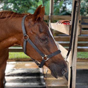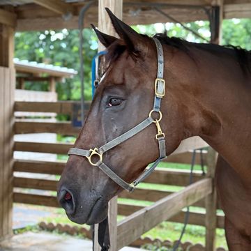 Bunny is a talented Warmblood gelding who enjoys teaching riders about pace and their first jumps. After a successful show career, he has stepped into the role of helping students step up to the next level with confidence. Gentle and good-humored, Bunny can take a joke and always tries his heart out for his rider. At Johnson’s Folly Horse Farm, he is loved not only for his lessons but also for his sweet nature, enjoying grazing, grooming, apples, and long, cool baths after work.